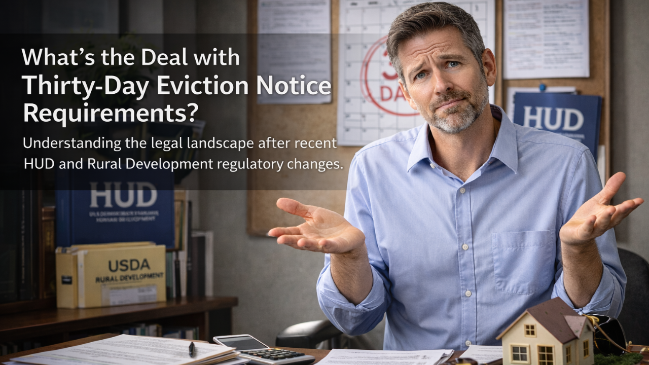 Recent changes to Rural Development and HUD housing guidance relating to 30-day notices of eviction have been a hot topic of conversation among housing providers. Here we will discuss the changes, what they mean, and the significant caution owners and agents should consider as they consult expert guidance on the matter.